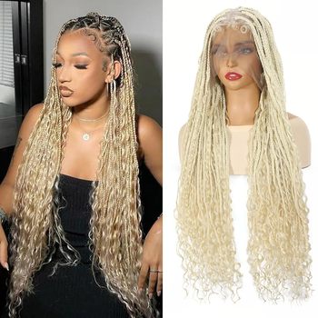 36 "Boho Knooploze Gevlochten Pruik Voor Zwarte Vrouwen Dubbele Full Lace Box Vlecht Pruik Met Baby Haar Bohemian Curly Ends Golden Blonde
